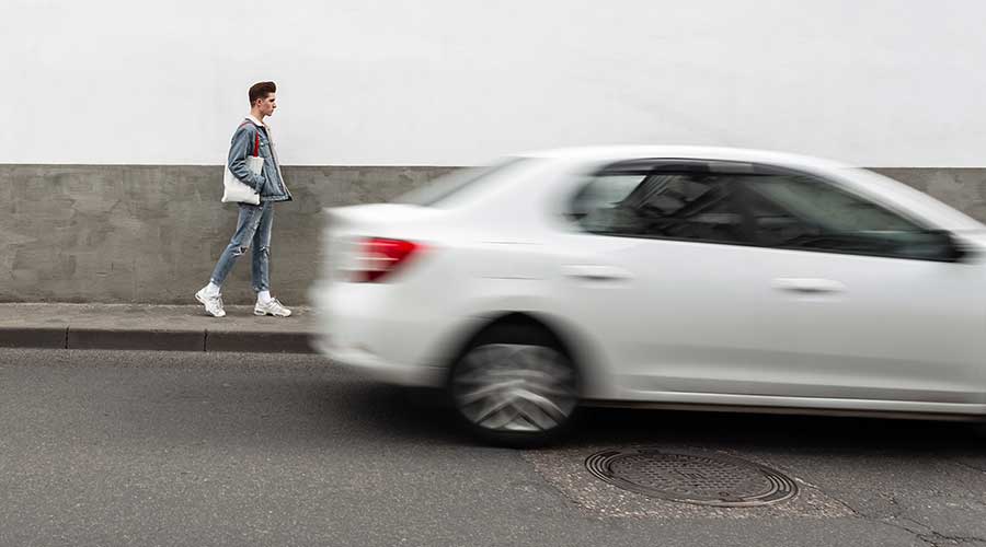 Here, a pedestrian walks along the roadway in the same direction as the vehicle. The AEB system must recognize that this is not a threat and avoid braking unnecessarily. NHTSA created two specific false-activation scenarios to make sure systems don’t confuse nearby motion with an imminent collision.